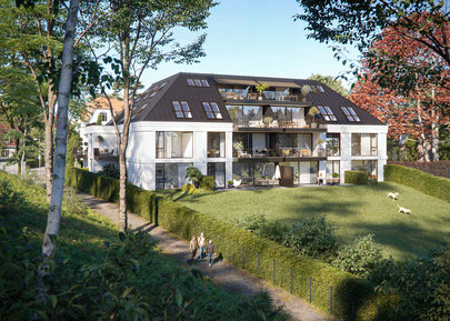 Eigentumswohnungen in Hamburg-Rahlstedt. Das Projekt ist ein Ensemble zweier ähnlicher Neubauten mit 36 Wohneinheiten, 2-4 Zimmer, Wohnungen von 55 bis 143 m² Wohnfläche, auf einer oder mehreren Ebenen (Maisonette, Staffelgeschoss).